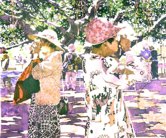 ![]() Years ago I used to sell work under the Lahaina banyan tree. Tour busses stopped by often and Japanese visitors would run through and take picture after picture, dressed in wild print combinations. One day I took a roll of film with a disposable camera, catching just that. All of these characters are off of that roll. available in print upon request |