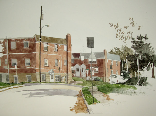 This is the corner of my block. IT is as close as I'l ever come to painting the house I grew up in. To me this says it. Sometimes it's more effective to depict the gateway to a place than any particular piece of it. It was right at this point I felt like I was home. |
