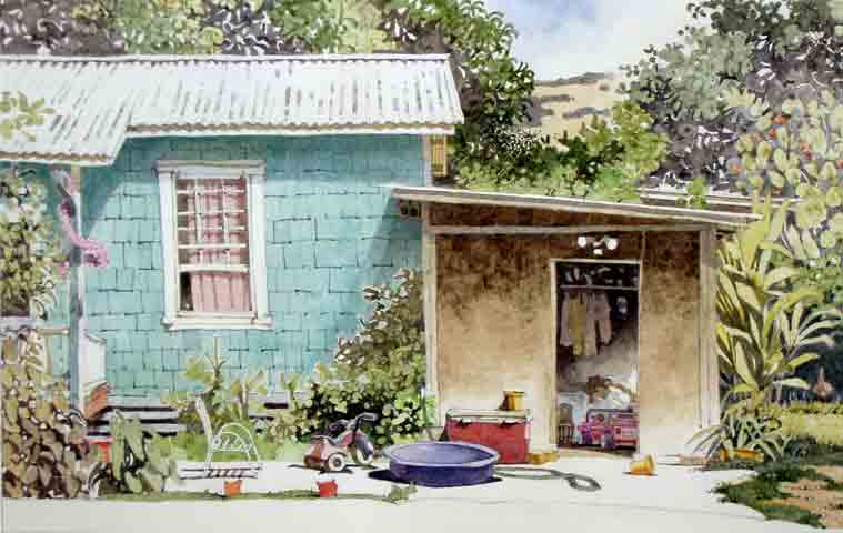 This Makawao scene had caught my eye many times in recent years. So many signs of life are always visible in the driveway. A window on the side of the shed, lets in enough light to show a Barbie jeep still-life within. |