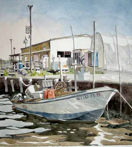 This is one of four paintings I did on this site. It's the place we went to crab as children. As I painted this, the owner of the boat came by, and told me he uses it to catch minnows. Minnows of course are a great live fishing bait. He supplied many of the local bait shops. | |