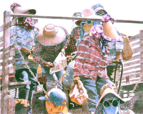 This painting I did a few years back from a photo I'd taken in '86. These workers are changing trucks at a labor station in Puunene. When I discovered the station, I felt like I'd found the best kept secret on the island. Early every morning they would show up on work trucks by the hundreds .... gather and talk for a few minutes then climb onto a new truck. That truck would carry them and their crew to whichever field they were working at the time. Because of their clothing and their unique language ...all chattering at once to quickly catch up, and the way they arrived and then disappeared in a matter of minutes, made it all seem surreal. |
