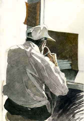 This man, with his wind breaker and ball cap, stopped into Anthony's Coffee Shop in Paia one day when I happened to have my camera. He was definitely not a typical coffee shop customer. I snapped a picture without him knowing it. I drew this into my sketch book along with a few other folks I had snuck a shot of that day. |