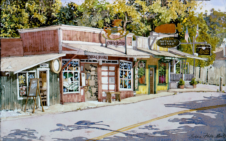 Baldwin Avenue in Makawao from corner to corner is truely a painting waiting to happen. I've done this section many times and each time is different. Here the word FLOAT is spelled on building blocks in the doorway. Cows are floating, a wooden airplane, boats and fish can be seen in the window. |