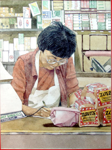 Mr. and Mrs. Horiuchi kept the Horiuchi market in Paia. It was the first place I stopped to paint when I landed. They bought that watercolor and that of the old gas station next door. I quickly came to appreciate her beautiful, warm and faithful smile. As did, I'm sure, everyone who knew her. They finally closed in the mid nineties. |