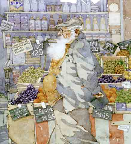 In the late 80's, I was able to spend six months in Paris. From the other side of the street, I sketched this man. I walked along with him as I drew. When he would stop and look toward me, I'd pretend I was drawing the roof tops. Later, I redrew him into this scene. |