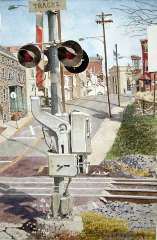 When I'm back in Pa. I say with my sister and brother in law in Royersford. I visit an old friend in Sping City right across the river just past this crossing. Every time I passed this scene on the way home it would hit me in the way a subject does. For a few cold days in December I sat in the front seat of my van and painted this. At the top of the hill a Christmas tree decoration hangs on a lamp post. |
