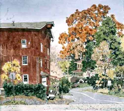 A friend and I were following the map through some back roads looking for a fishing spot, when we came upon this scene. I came back the next day to paint this. It's an old saw mill. It happens to be right beside a small skiing spot. I'd always heard about it but never knew where it was. That winter My sisters and I started skiing there. My nephew finally got me snow boarding. I love this piece. I especially like the little house and porch down the road. |