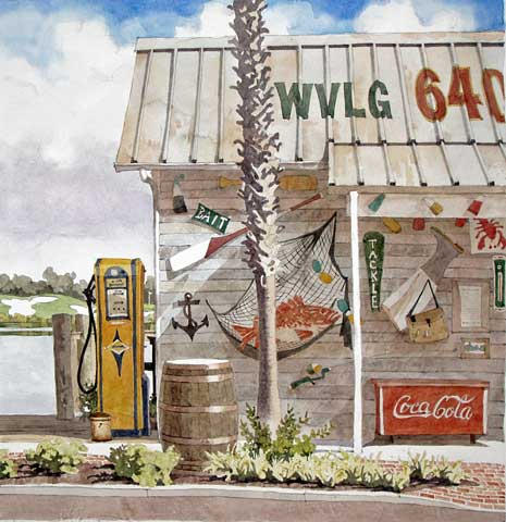 Visiting back east I stopped to see my mom for a month in Florida at "The Villages". It is no doubt the most amazing retirement community in the world. The town centers have all been beautifully fashioned to look like they were built about eighty years ago. The architecture is just a small part of what there is to enjoy. The people, the activities, the entertainment, restaurants, the common courtesy, you name it.... I look forward to going back. The Villages radio station is located here in this make believe bait shop. The station pumps what I consider the best music ever recorded into the town squares morning noon and night. Dance classes are held daily and hundreds of people come out to the square to dance at night. |